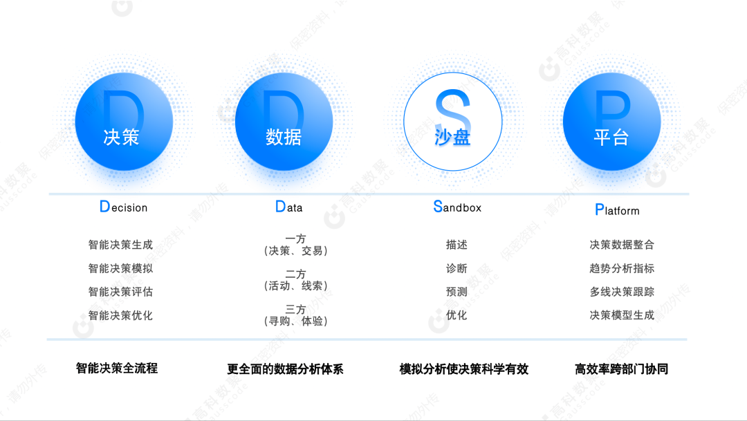 董琳介绍到,韦德国际1946推出韦德国际1946智慧决策平台DDSP(Decision Data Sandbox Platform),将从市场、销售、服务,以及智造研发等重要应用场景出发,从传统的经验主义决策方式向基于数据驱动的数智化决策全面升级。平台架设30+决策场景沙盘、三方多维数据指标、标签建设能力、百余预测决策模型能力,而且将持续在平台进行新增以及实现模型自我生长。